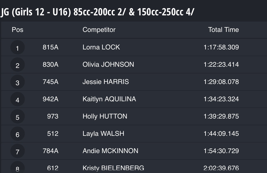 The first round of the Australian Enduro Championship took place this weekend in Roma. Jessica Gardiner is the defending champion in the Women’s category, and her protégé Lorna Lock is the reigning Junior Girls champion. Due to heavy rain overnight from Saturday to Sunday, the second day of racing was cancelled. See the results below.