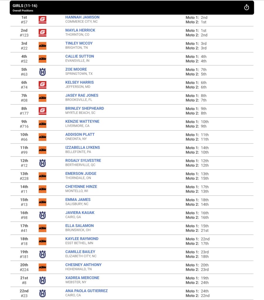 Callie Sutton secures fourth place once more. With a good pace at the start of the race behind McCoy, she faded in the final laps. Fourth overall, ahead of Zoe Moore, who edged out Kelsey Harris for fifth place overall. A great battle between two riders who showed potential this week. Jaley Rae Jones takes seventh place overall, ahead of Brinley Shepheard and Kenzie Watteyne. Addison Platt completes the top 10 with two eleventh-place finishes.