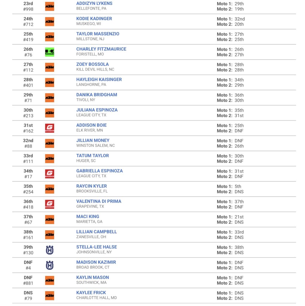 Note that Raycin Kyler did not start the second race after suffering a heavy crash in another class.