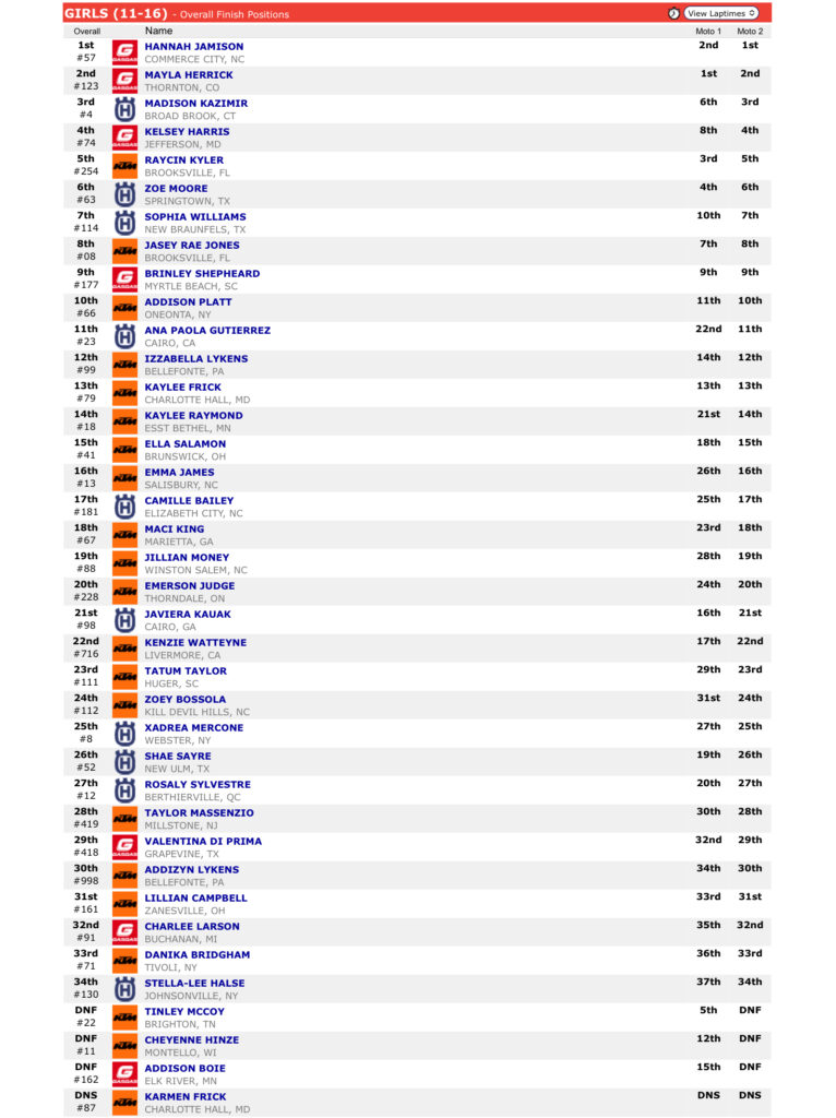 The final lap saw four riders locked in a tight contest for the last podium spot. In the end, Madison Kazimir emerged with third place, holding off Kelsey Harris and a flying Raycin Kyler, who completed a strong recovery after her rough opening lap. Zoe Moore secured sixth thanks to a strong final push, finishing just ahead of Sophia Williams.